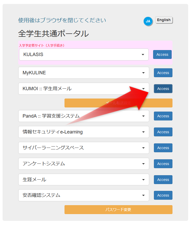 ⅰKUMOIにアクセスします.(全学生共通ポータルからもアクセス可能です:下図)