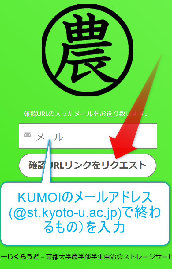 ⅱ先程メモしたKUMOIのメールアドレスを入力し「確認URLリンクをリクエスト」してください.